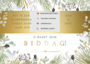 Op woensdag 11 maart is het biddag en organiseert KIK (Kind in Kerk) een middag voor de kinderen. Het is een inloop middag. Tussen 14.00 en 16.00 uur kan je langs komen. Kan je maar een half uurtje of een uurtje, het is allemaal mogelijk!